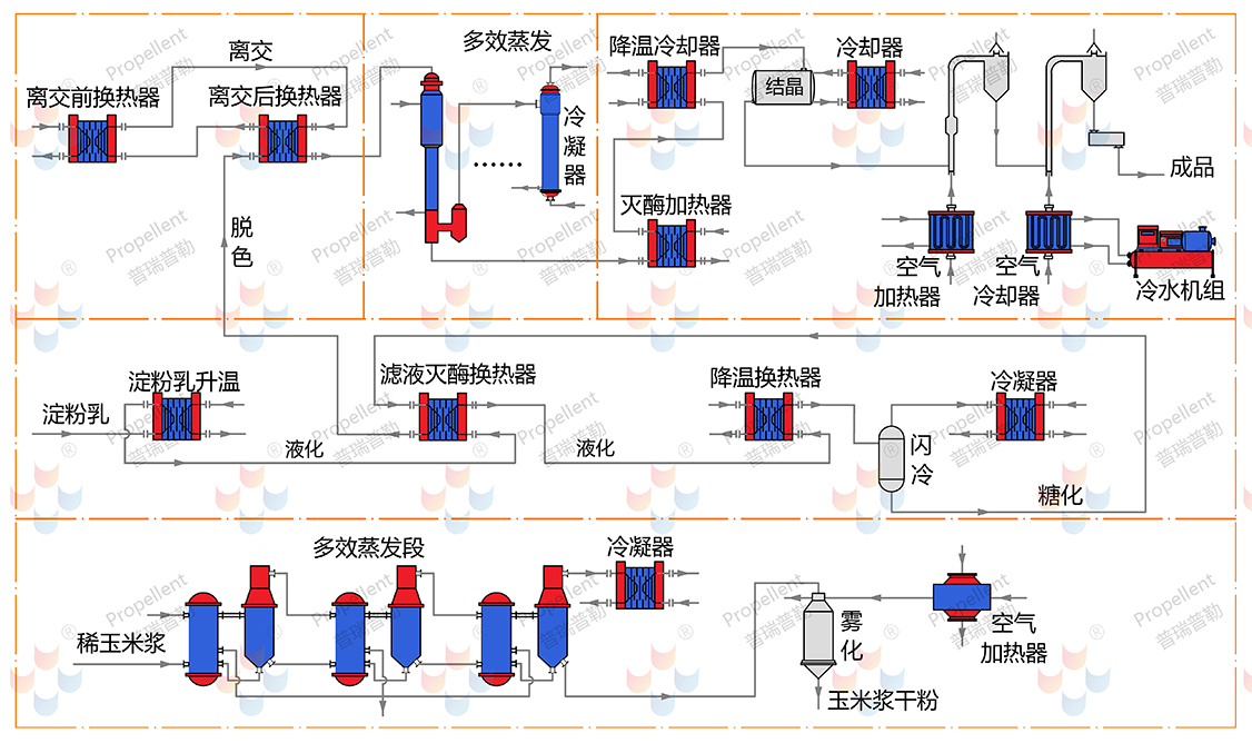濃糖漿滅酶加熱、降溫冷卻通過寬流道板式換熱器,來控制結(jié)晶冷卻前的溫度。